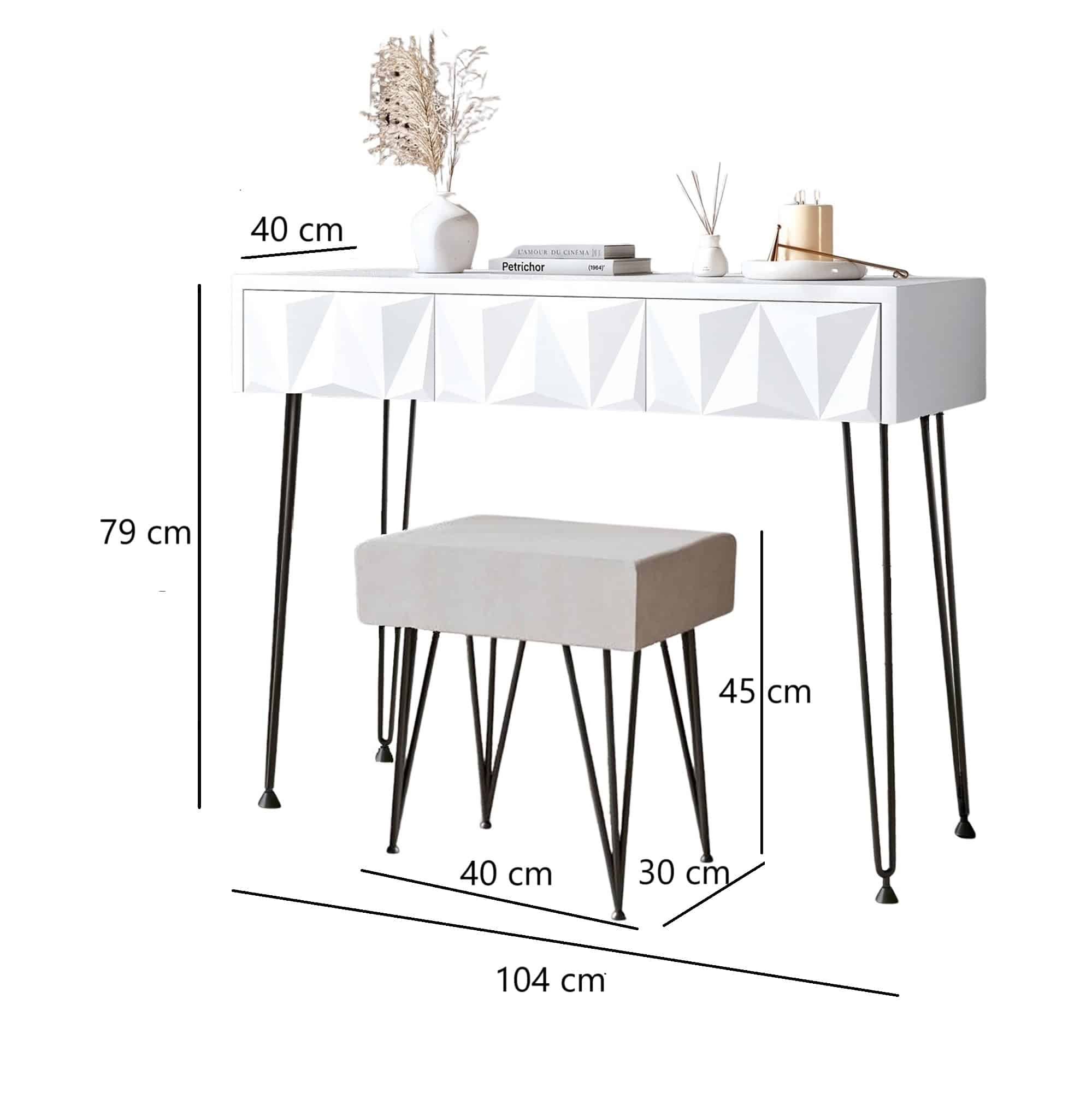 The Claudia White Dressing Table is a modern and elegant piece designed with both style and functionality in mind. It features three spacious drawers, each with a striking three-dimensional geometric pattern on the surface, adding a bold and contemporary flair to the design. The drawers are equipped with high-quality sliding mechanisms for smooth and easy operation. Inside, the drawers are lined with luxurious grey velvet, providing a soft and protective space for storing personal items.