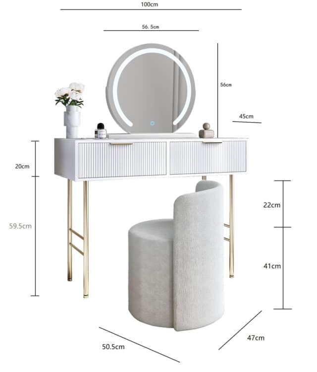 • Overall Dimensions – Table:L100 x D45 x 79.5(H)cm / Mirror Diameter: 55cm, Overall Size: W56 x D10 x H56cm/Stool: H63cm x W47cm x D50.5cm Seat Height: 41cm