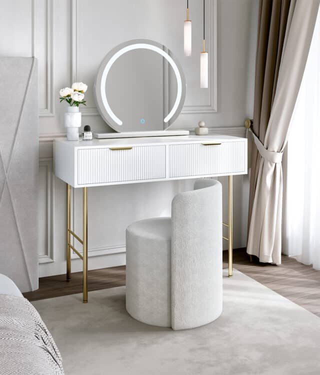 Complementing this stunning set is the Lottie Bouclé Stool. Lottie adds comfort and a sleek touch to your beauty space. Whether paired with the set or used as a standalone piece, it provides a luxurious upgrade to any interior.