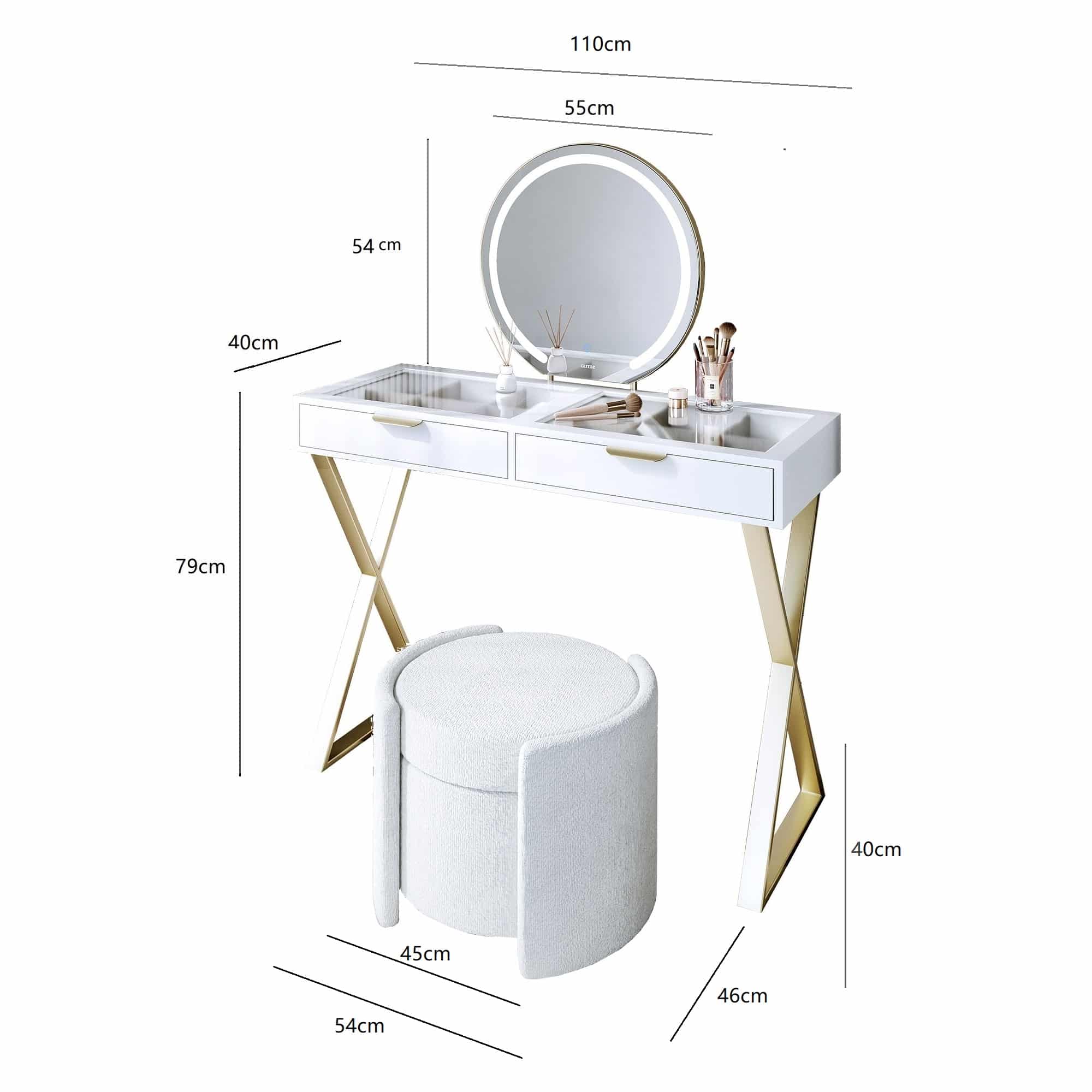 Elevate your space with this modern and chic Jess dressing table, a perfect blend of style and functionality. Featuring a sleek white finish, it includes two spacious drawers lined with soft grey compartments, ideal for organizing cosmetics, jewellery, and accessories. The glass tabletop not only adds sophistication but also offers a clear view of the contents within the drawers, enhancing both practicality and style. Its minimalist silhouette ensures it complements contemporary interiors effortlessly.The standout design features X-shaped gold metal legs, providing a sturdy foundation and a luxurious modern look. Gold-finished handles complement the legs, creating a cohesive and refined aesthetic.