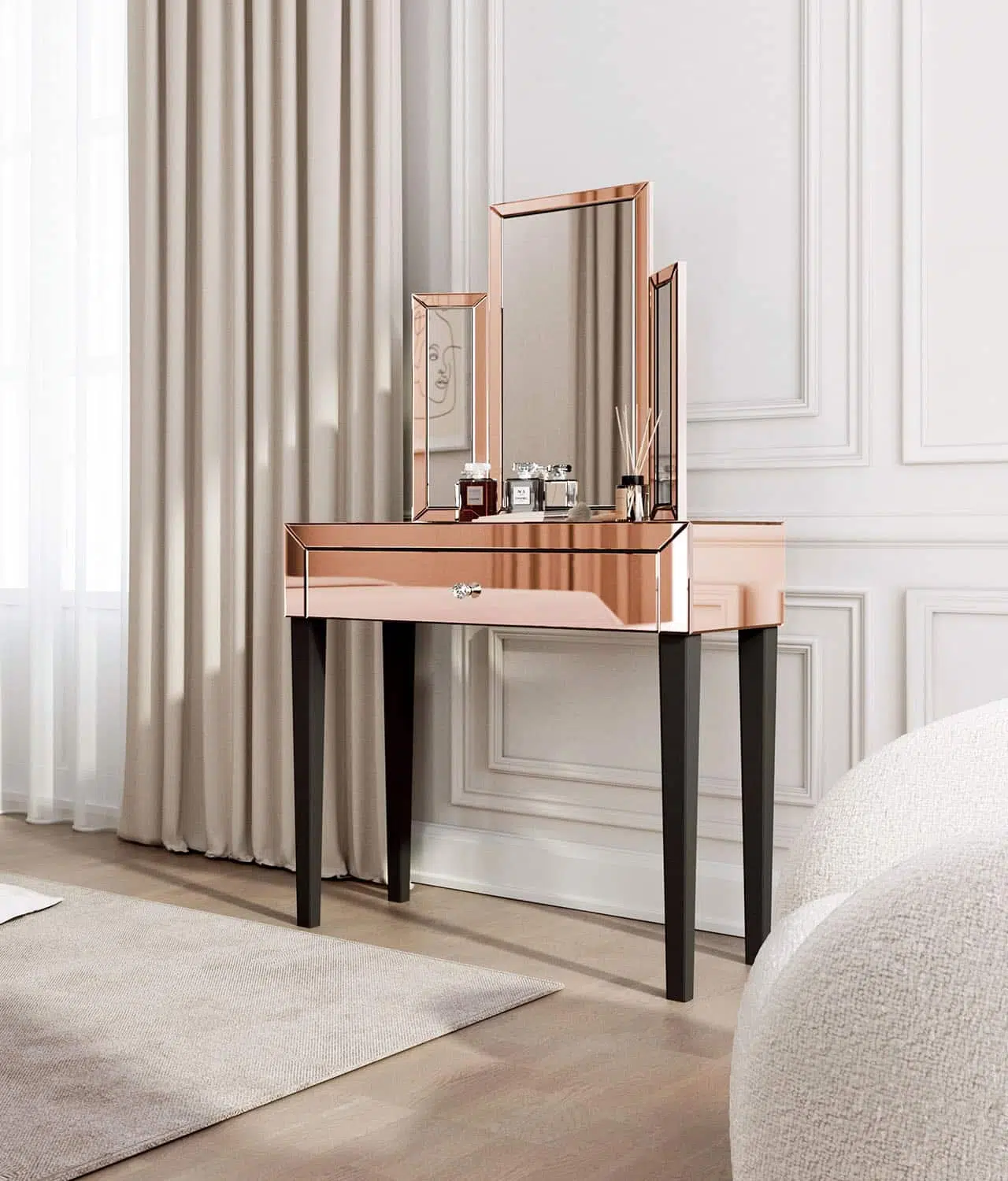 Make a statement with the rose gold Paloma x Laguna mirrored dressing table with tri-fold mirror.