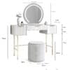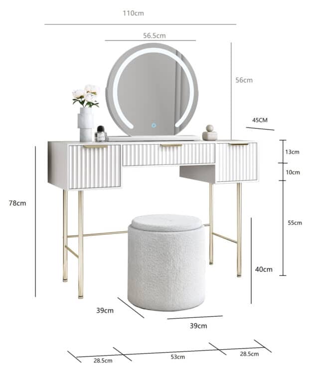 - Overall Dimensions -L110 x D45 x H133.5 cm / Table: L110 x D45 x H77.5 cm / Mirror Diameter: 55cm, Overall Size: W56 x D10 x H56 cm/Stool: H40cm x W39cm x D39cm