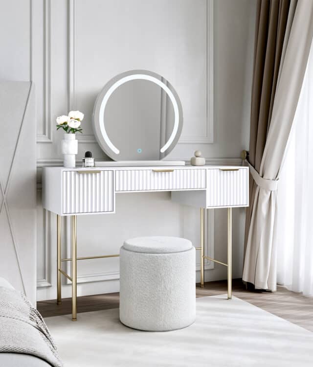 Taking pride of place on top of the vanity table is Elsie LED mirror. The mirror rests on a sturdy rectangular base with a refined white finish, bringing a touch of sophistication to any room.The LED lighting around the mirror offers dimmable brightness, which can be adjusted through a responsive touch sensor. Tapping the sensor allows you to switch between three color settings: warm, cool, and daylight, ensuring the ideal lighting for various activities, whether styling hair, prepping beauty routines, or snapping selfies. Holding down the sensor adjusts brightness, allowing for customized ambient lighting based on your preferences. The mirror is rotatable, allowing for easy adjustment to your preferred angle.