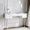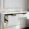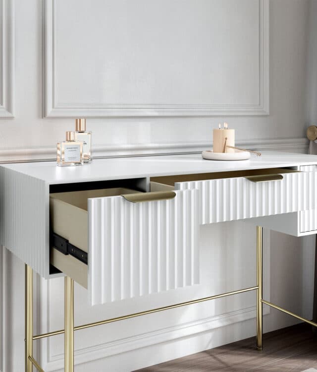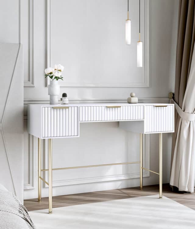 The Lara Dressing Table is an elegant and contemporary furniture piece designed for both style and functionality. Featuring three spacious drawers with ridged fronts and a sleek white painted finish, it offers ample storage for all your essentials. The high-quality sliders ensure smooth drawer operation, while the textured beige interior lining adds a touch of sophistication. Complemented by stunning gold handles and legs, this piece exudes a refined aesthetic that seamlessly blends with any decor.