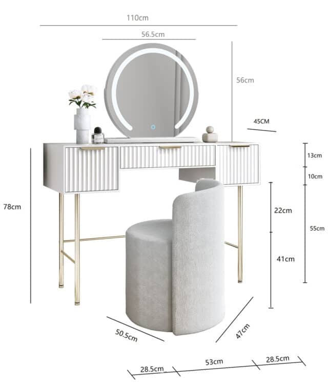 - Overall Dimensions -L110 x D45 x H133.5 cm / Table: L110 x D45 x H77.5 cm / Mirror Diameter: 55cm, Overall Size: W56 x D10 x H56 cm/Stool: H63cm x W47cm x D50.5cm Seat Height: 41cm
