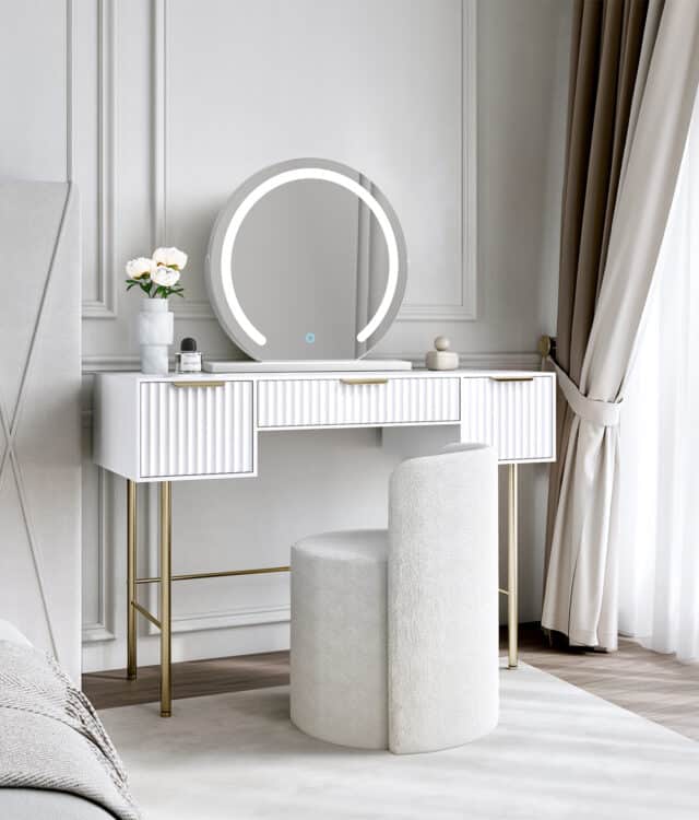 Taking pride of place on top of the vanity table is Elsie LED mirror. The mirror rests on a sturdy rectangular base with a refined white finish, bringing a touch of sophistication to any room.The LED lighting around the mirror offers dimmable brightness, which can be adjusted through a responsive touch sensor. Tapping the sensor allows you to switch between three color settings: warm, cool, and daylight, ensuring the ideal lighting for various activities, whether styling hair, prepping beauty routines, or snapping selfies. Holding down the sensor adjusts brightness, allowing for customized ambient lighting based on your preferences. The mirror is rotatable, allowing for easy adjustment to your preferred angle.