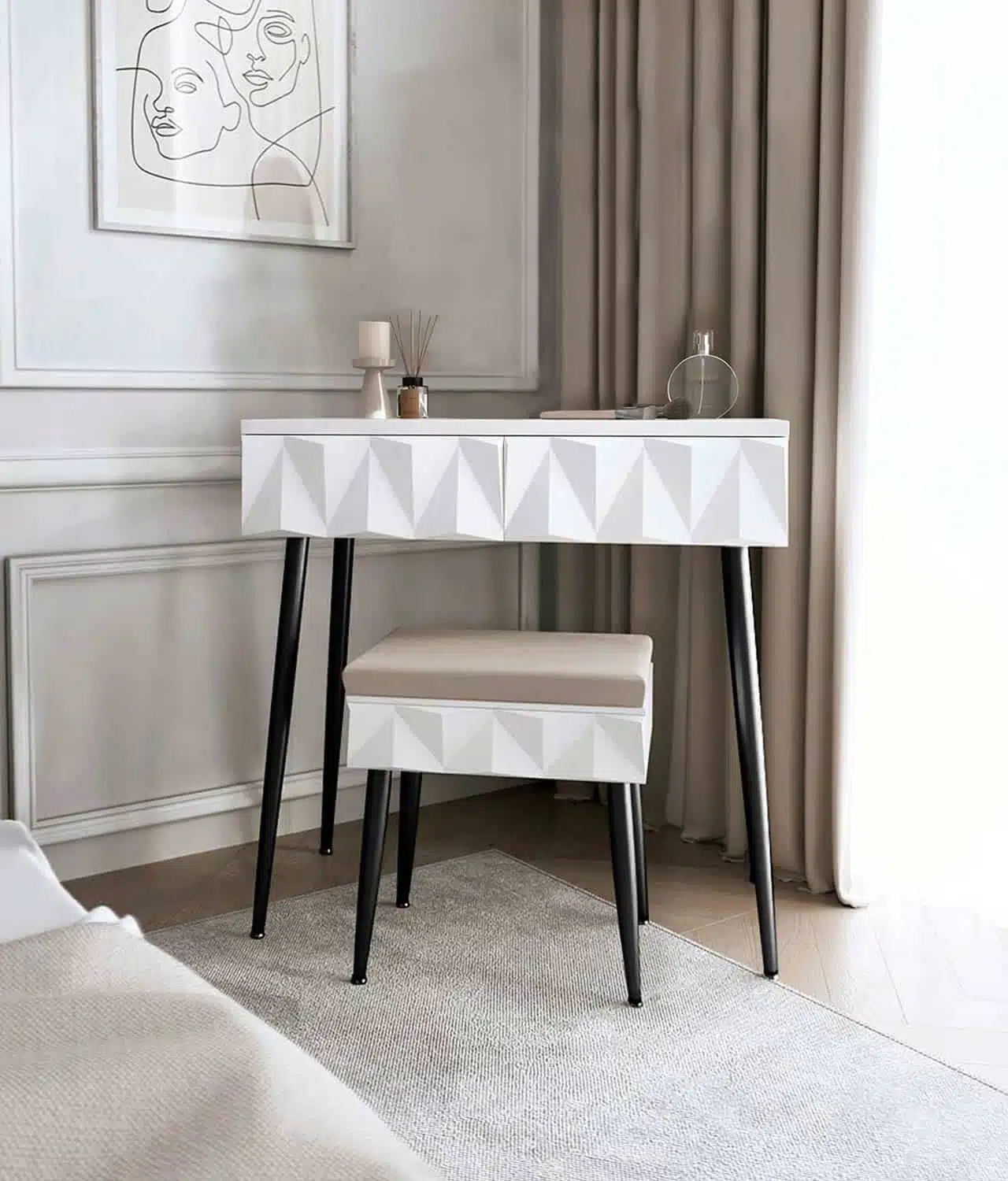 Montana is a sophisticated and contemporary dressing table set that effortlessly brings a touch of style and contemporary charm to any bedroom or dressing room. This striking vanity table set showcases a contemporary geometric design, adding a fresh and on trend aesthetic to your space.