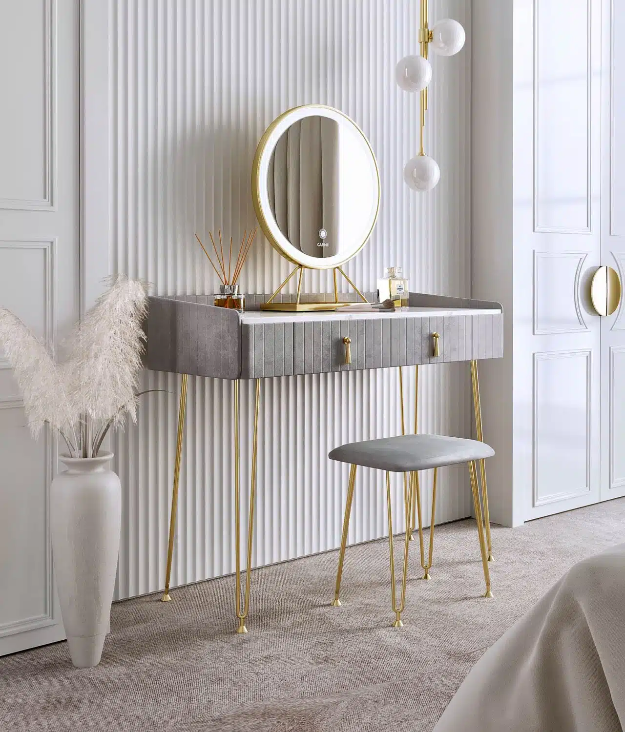 Tokyo Glow Dove Grey Velvet Dressing Table with LED Touch Sensor Mirror